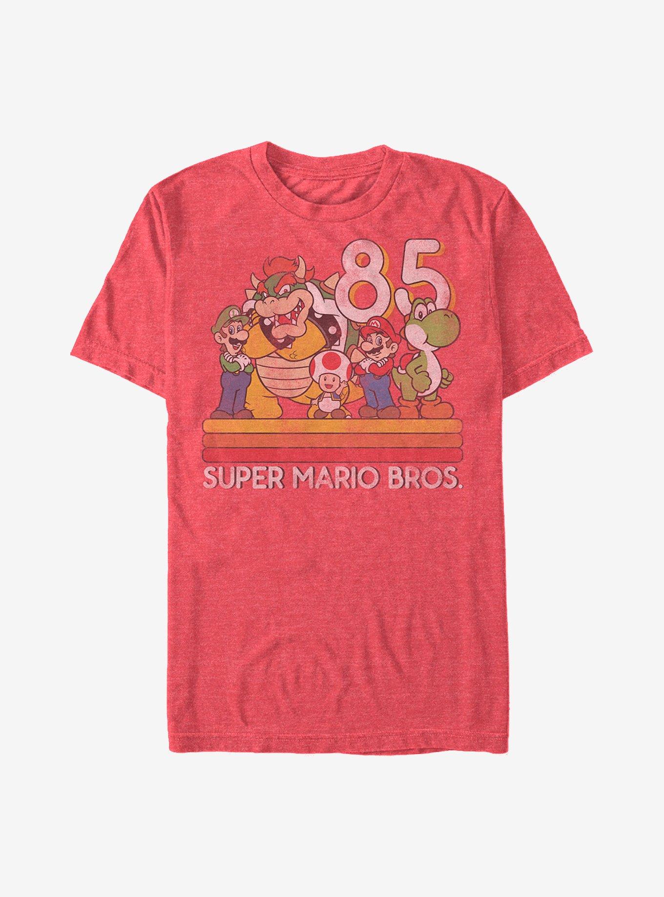 Some of your favorite cast of video game characters take center stage on the Nintendo Super Mario Bros Group 85 Heather Red T-Shirt. Mario, Luigi, Bowser, Toad, and Yoshi are featured in a retro distressed style with "85" in the background on this red Nintendo shirt. 50% Cotton, 50% Polyester.
