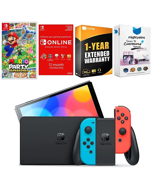 Nintendo Switch Neon Red & Blue Oled Console with Mario Party Superstars, Nso 12 Month Family Membership