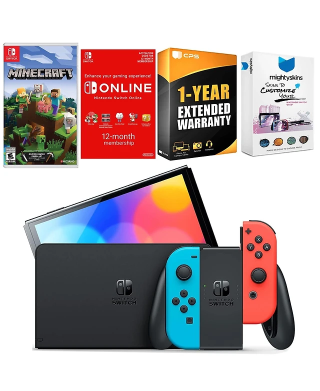 Nintendo Switch Neon Red & Blue Oled Console with Minecraft: Switch Edition, Nso 12 Month Family Membership, MightySkins Console and Controller Skin V