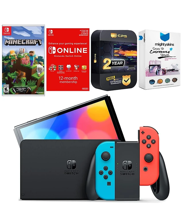 Nintendo Switch Neon Red & Blue Oled Console with Minecraft: Switch Edition, Nso 12 Month Family Membership, MightySkins Console and Controller Skin V