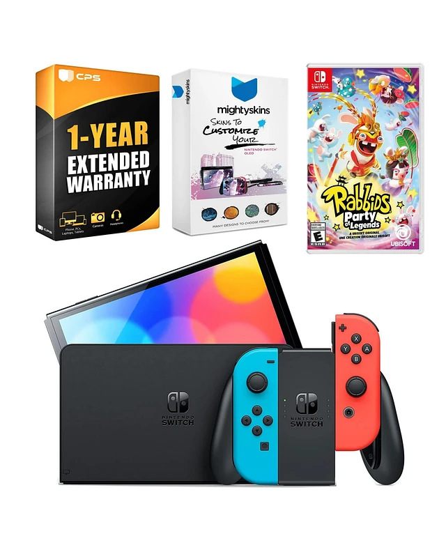 Nintendo Switch Neon Red & Blue Oled Console with Rabbids: Party of Legends, MightySkins Console and Controller Skin Voucher, and 1 Year Cps Extended