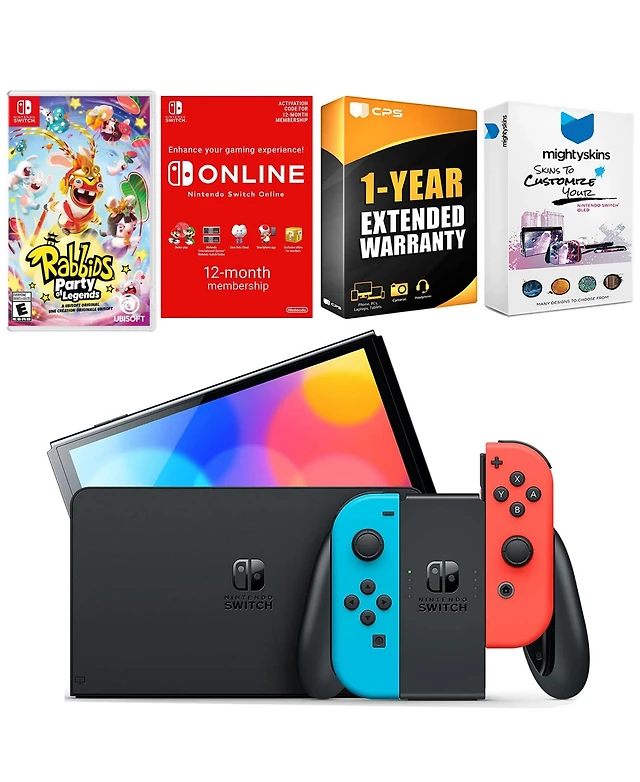 Nintendo Switch Neon Red & Blue Oled Console with Rabbids: Party of Legends, Nso 12 Month Family Membership