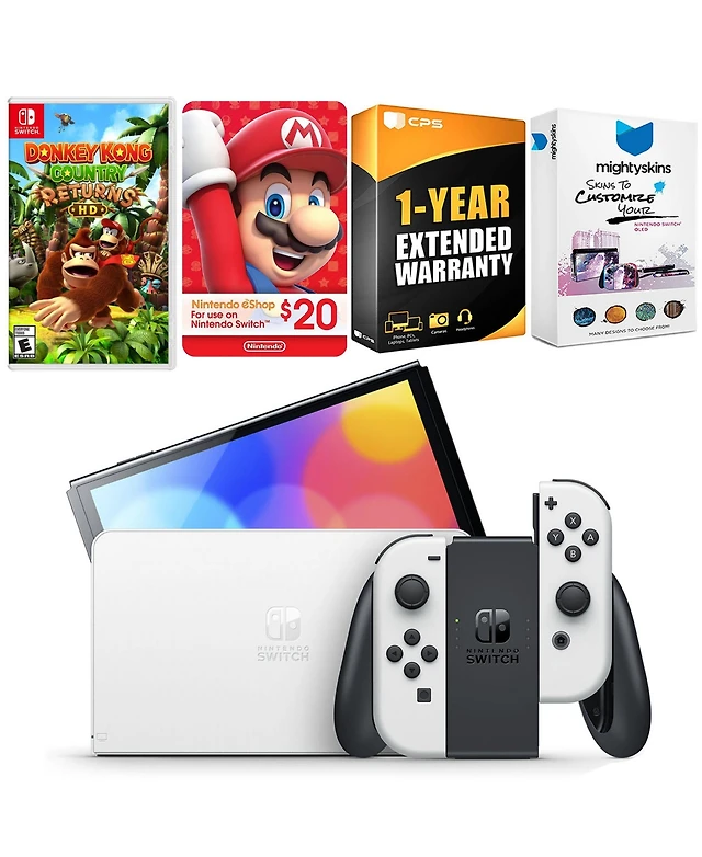 Nintendo Switch White Oled Console with Donkey Kong Country Returns Hd, Nintendo $20 eShop Gift Card, MightySkins Console and Controller Skin Voucher