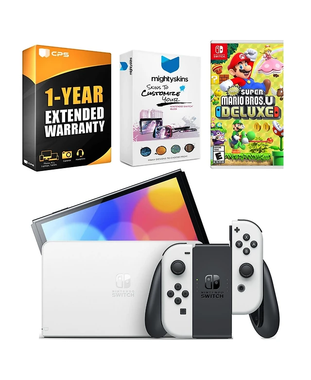 Nintendo Switch White Oled Console with New Super Mario Bros. U Deluxe, MightySkins Console and Controller Skin Voucher