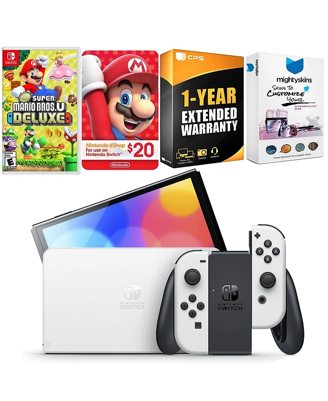 Nintendo Switch White Oled Console with New Super Mario Bros. U Deluxe, Nintendo $20 eShop Gift Card, MightySkins Console and Controller Skin Voucher,