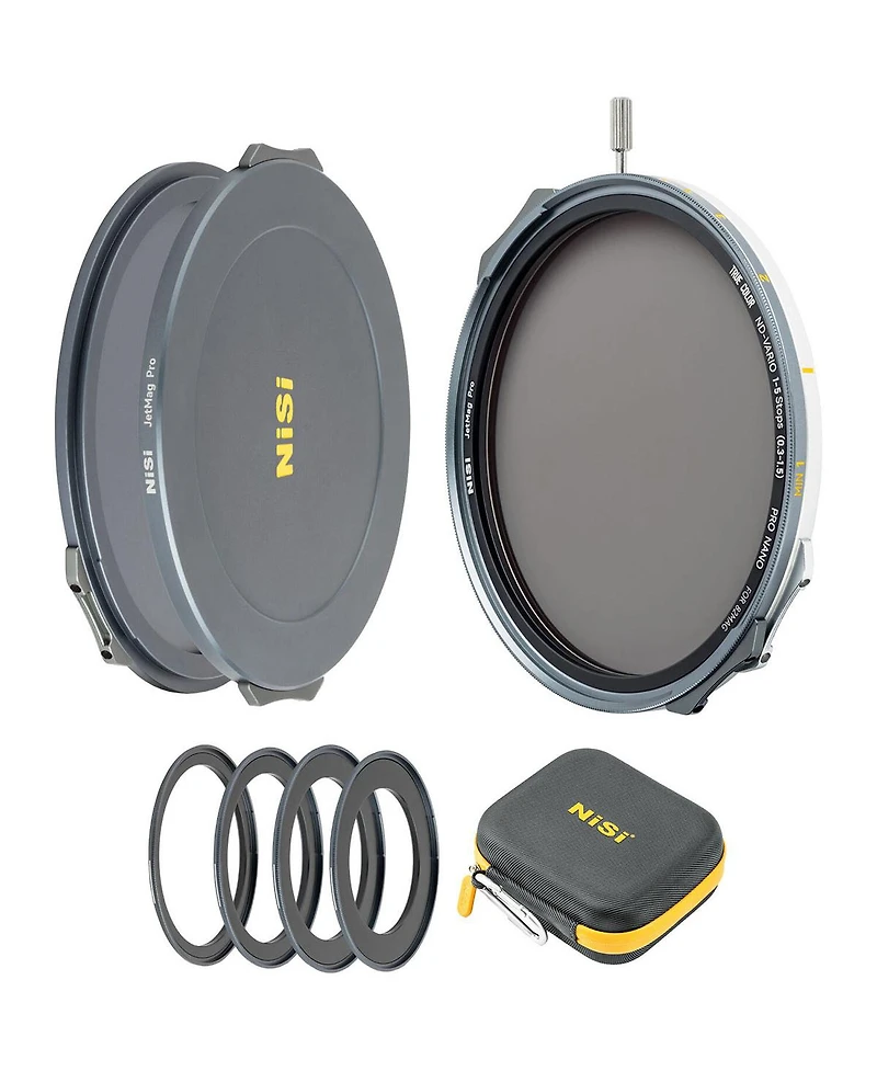 The NiSi JetMag Pro Vnd Flex Kit is a complete, high-performance variable Nd solution for creators who shoot across multiple lenses. Featuring NiSi's industry-leading True Color Nd-vario Pro Nano technology and the intuitive JetMag Pro magnetic mounting system, this kit includes everything you need to achieve fast, accurate light control-no matter what lens you're using.Built around the 1-5 stop (ND2-ND32) JetMag Pro Variable ND, the Flex Kit adds magnetic adapter rings for 67mm, 72mm, 77mm, and 82mm lens threads, plus front and rear magnetic caps and a padded caddy pouch for safe storage and quick access in the field. Whether you're filming on a gimbal or switching lenses on the fly, this all-in-one setup ensures you're always ready.True Color Accuracy with No CompromiseSay goodbye to unwanted color shifts. NiSi's True Color technology ensures neutral, color-accurate results, preserving consistent tones across the full ND range.