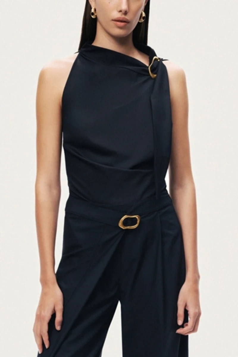 A sleek sleeveless blouse defined by an asymmetric neckline and a sculptural metal buckle detail. Designed to elevate minimal looks with a refined, modern edge.