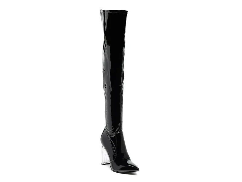 The Noire over-the-knee boot from London Rag lends a fresh inspiration to your fall outfit. This thigh high boot with a sleek upper is contrasted with a clear block heel for an unexpected chic flair.