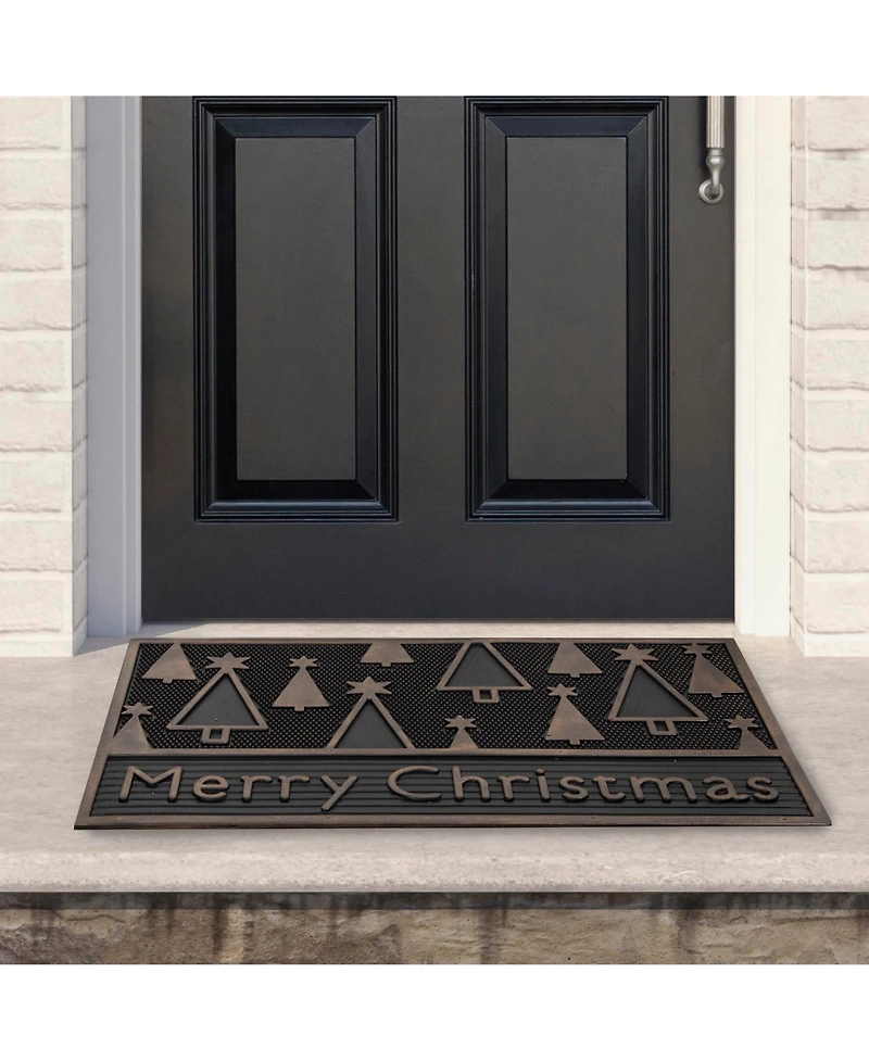 Add this festive Christmas doormat to your holiday decor. Featuring Christmas trees with a ""Merry Christmas"" and various Christmas tree in bronze against a black background this mat will welcome guests into your home this holiday season.