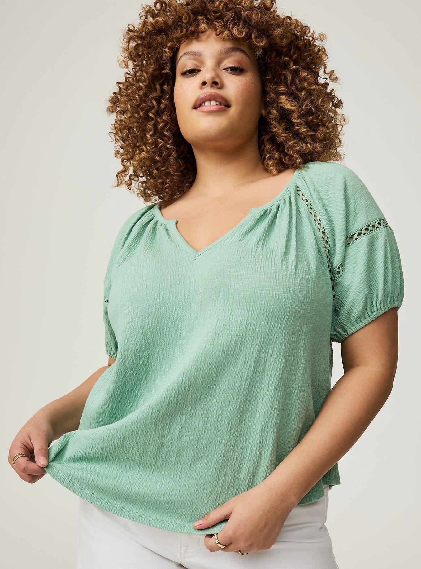 FIT Measures 30"" from shoulder (size 2). MATERIALS + CARE Cotton-blend knit fabric. 95% cotton, 4% polyester, 1% spandex. Machine wash cold. Tumble dry low. Imported. DETAILS Notched crew neckline. Short sleeves. Crochet sleeve detail