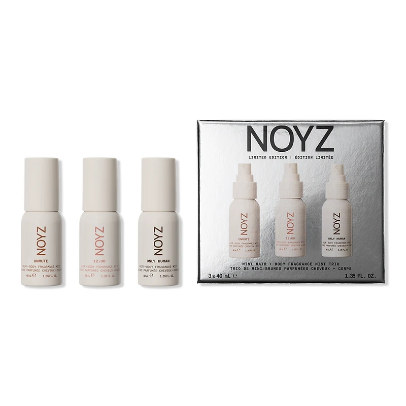HAIR + BODY FRAGRANCE MIST TRIO. Features: NOYZ. Scent, unfiltered. For all genders. A new dimension of self-expression.. Certified vegan by The Vegan Society and cruelty free by PETA.. Formulated without parabens, phthalates, synthetic dyes or animal by-products.. Bottles are designed to be disassembled and recycled.. Includes: UNMUTE (1.35 oz), 12:00 (1.35 oz), ONLY HUMAN (1.35 oz). Fragrance Family: UNMUTE: Vanilla/Amber. 12:00: Warm/Sweet Gourmand. ONLY HUMAN: Skin-Hugging Gourmand. Key Notes: UNMUTE- Top: Indonesian Cassia / Black Plum / Clary Sage / Ceylon Cinnamon / Pistachio -- Middle: Cashmere Woods / Spanish Ciste / Somalian Incense -- Base: Madagascar Vanilla / Crisp Amber. 12:00- Top: Australian Pink Pepper / Jasmine Petals / Saffron -- Middle: Raspberry / Creamy Blonde Woods -- Base: Ambroxan/ Spun Sugar/ French Oakmoss. ONLY HUMAN- Top: Pink Pepper / Italian Bergamot -- Middle: Waterlily / Bamboo -- Base: Vanilla Bean / Ambroxan / Cedarwood.