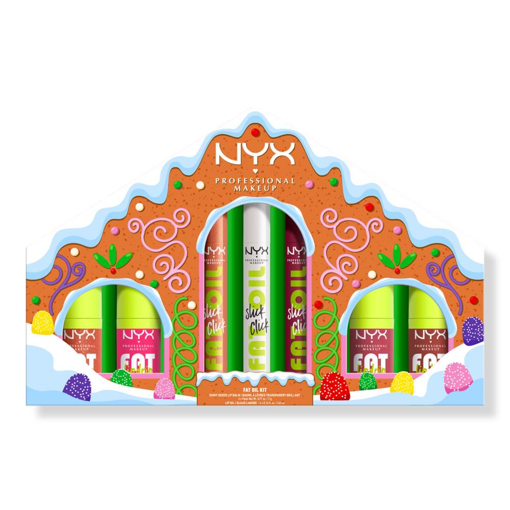 FAT GINGERBREAD HOUSE KIT. Benefits: Indulge in holiday sweetness with the NYX Professional Makeup Holiday Fat Gingerbread House Kit.. This limited-edition set features luscious Fat Oil Lip Drip glosses and Fat Oil Slick Click Balms inspired by the cozy vibes of the season.. Delivering 12-hour hydration and a high-shine, non-sticky finish, your lips will be soft, smooth, and glossy.. Infused with nourishing oils like raspberry, cloudberry, and squalane, the formula glides on effortlessly, providing a sheer wash of color and a shiny finish.. Whether youre baking cookies, sipping cocoa, or celebrating at a party, this kit keeps your lips looking and feeling their best. Packaged in charming gingerbread house-inspired packaging.. Includes: Full size Fat Oil Lip Drip in Livin The Cream. Full size Fat Oil Lip Drip in Sprinkle Sprinkle. Full size Fat Oil Lip Drip in Follow Back. Full size Fat Oil Lip Drip in Missed Call. Full size Fat Oil Slick Click in That's Major. Full size Fat Oil Slick Click in Going Live. Full size Fat Oil Slick Click in Group Chat. :