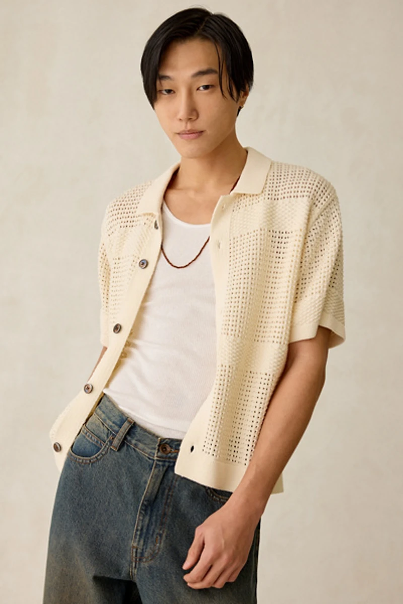 Classic look polo collar sweater by streetwear label OBEY. Textured knit short sleeve sweater with a partial button closure at the front. Cut in a standard fit and finished with ribbed knit trims.