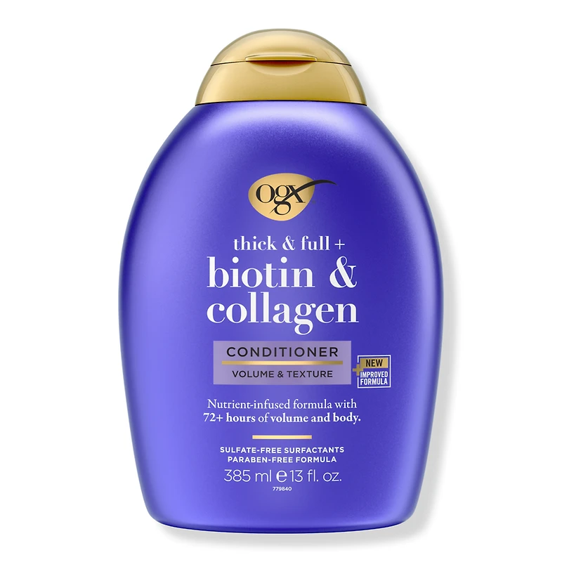 THICK & FULL BIOTIN & CLLGN COND 13.0OZ. Benefits: OGX Thick & Full + Biotin & Collagen Volumizing Conditioner for hair with 72+ hours of volume & body. Condition with this nutrient-infused biotin & collagen formula gives hair volume & texture. New LipiPro Shield (TM) Technology delivers 2x more protein & lipid protection** for healthy hair. **vs. non-conditioning shampoo, with continuous use. Volume conditioner supports hair's protein & lipid barrier for your heathiest hair. Use bergamot, jasmine & vanilla scented conditioner with OGX shampoo for your hair routine. New & improved texturizing conditioner gives you healthy hair in just 1 wash. Formulated Without: Carefully formulated to be without sulfated surfactants, parabens, phthalates, microplastics, & dyes. :