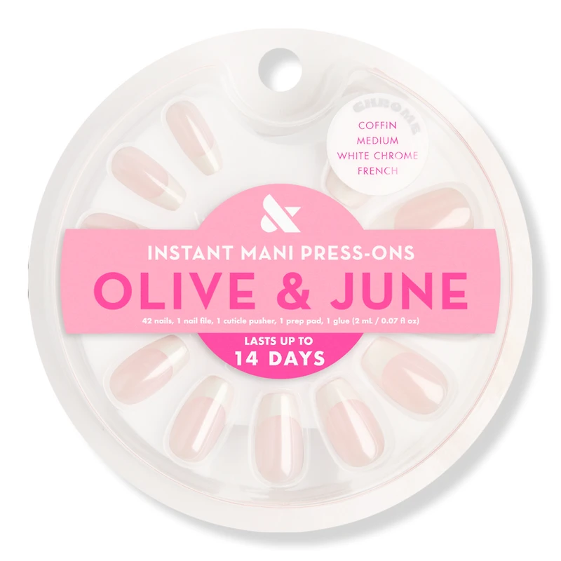 INSTANT MANI WHITE CHROME FRENCH. Features: A white french tip with a glazey-chrome topper in a medium coffin shape.. Benefits: Realest-looking fake nails. Lasts up to 14 days. Non-damaging glue. Your best, realest-looking fit. More sizes than any brand. Made with 94% recycled materials. Includes: 42 nails, 1 nail file, 1 cuticle pusher, 1 prep pad, 1 glue.