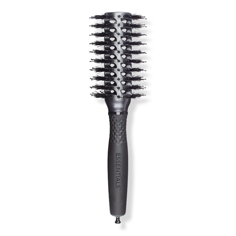 ESSENTIALS STYLING ROUND SMOOTHING BRUSH. Benefits: Heat resistant vegan boar bristles. Ideal for creating volume or straightening. Lightweight brush design. Features: 2 1/4" diameter. Vegan boar & ionic bristles. Vented barrel boosts ventilation for faster drying. Ergonomic comfort grip handle designed for effortless rotation. Retractable sectioning pick. Snag-free neck ring. :