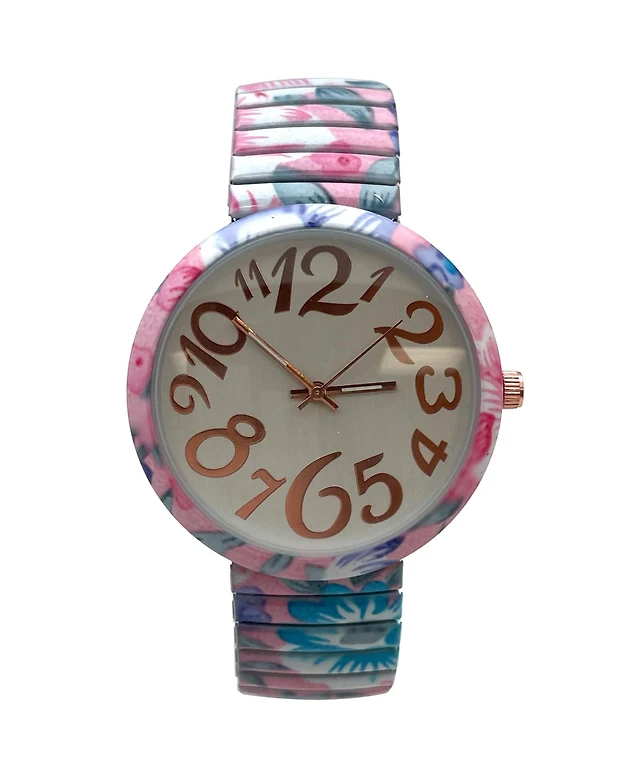 Olivia Pratt Light Blue Floral Big Dial Easy Reader Watch Floral Elastic Stretch Band Wristwatch Women Watch