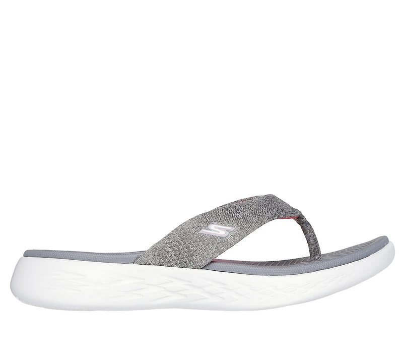 Choose the perfect sandal for summer comfort and style in the Skechers On the GO 600 - Preferred sandal. Soft knit fabric in a sporty casual comfort 3 point thong sandal with Goga Max® Contour Footbed and Skechers GOrun 600 design sole.