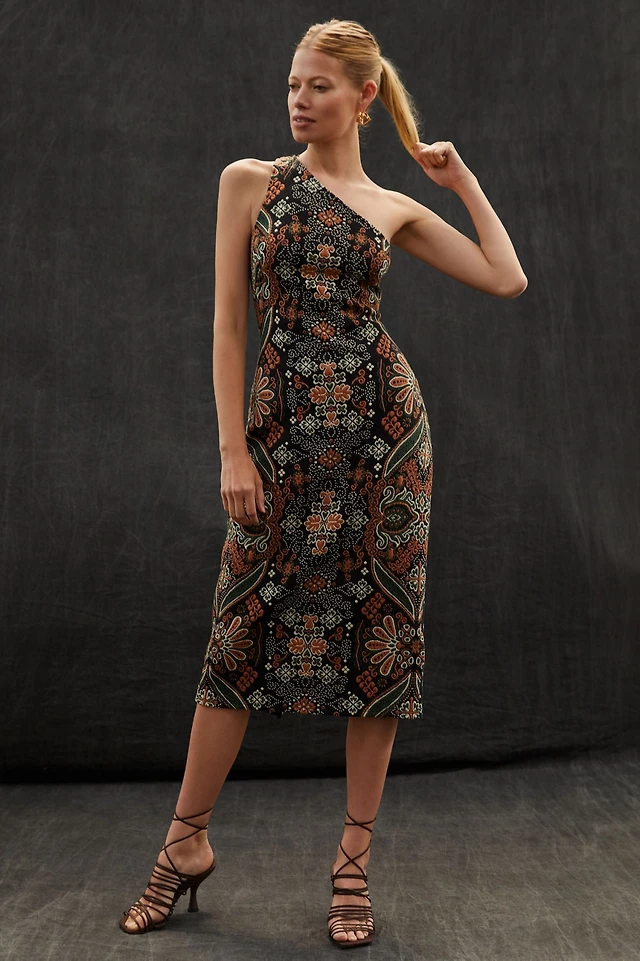 By Anthropologie One-Shoulder Printed Slim Midi Dress