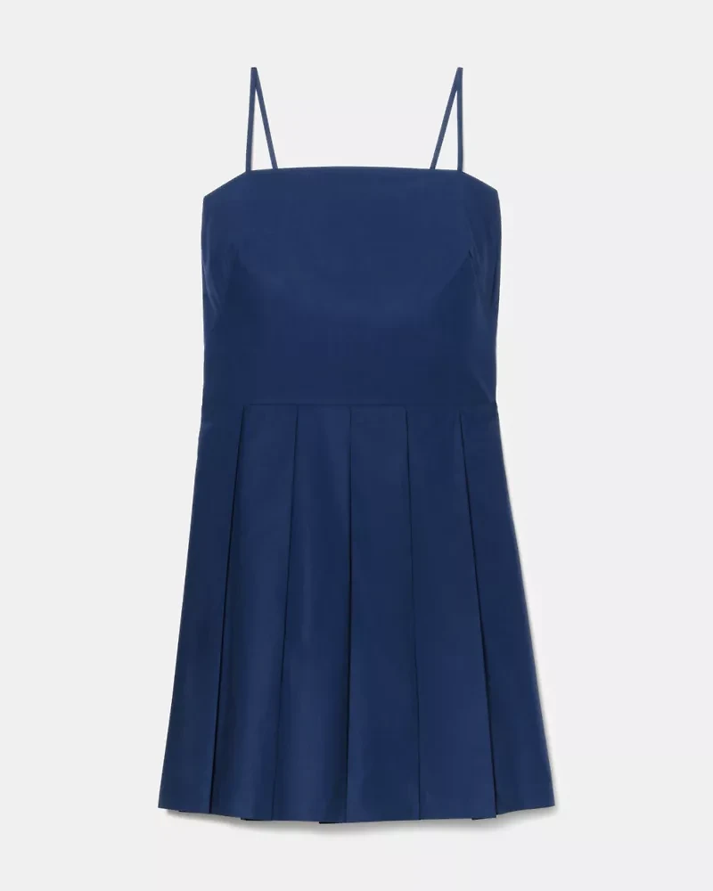 A little structured...a little surprising. This cotton poplin dress feels classic and tailored, with an A-line shape and crisp pleated skirt. But its open back detail, tied with a bow, ensures you'll make a memorable exit at all your summer parties and warm-weather outings.