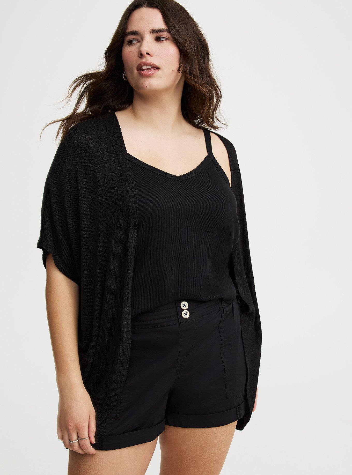 FIT Model is 5'11'' wearing size 1. Measures 40'' from shoulder (size 2). MATERIALS + CARE Hacci knit fabric. 90% rayon, 7% polyester, 3% spandex. Machine wash cold. Dry low. Imported. DETAILS Open front. Short sleeves. Curved hem.