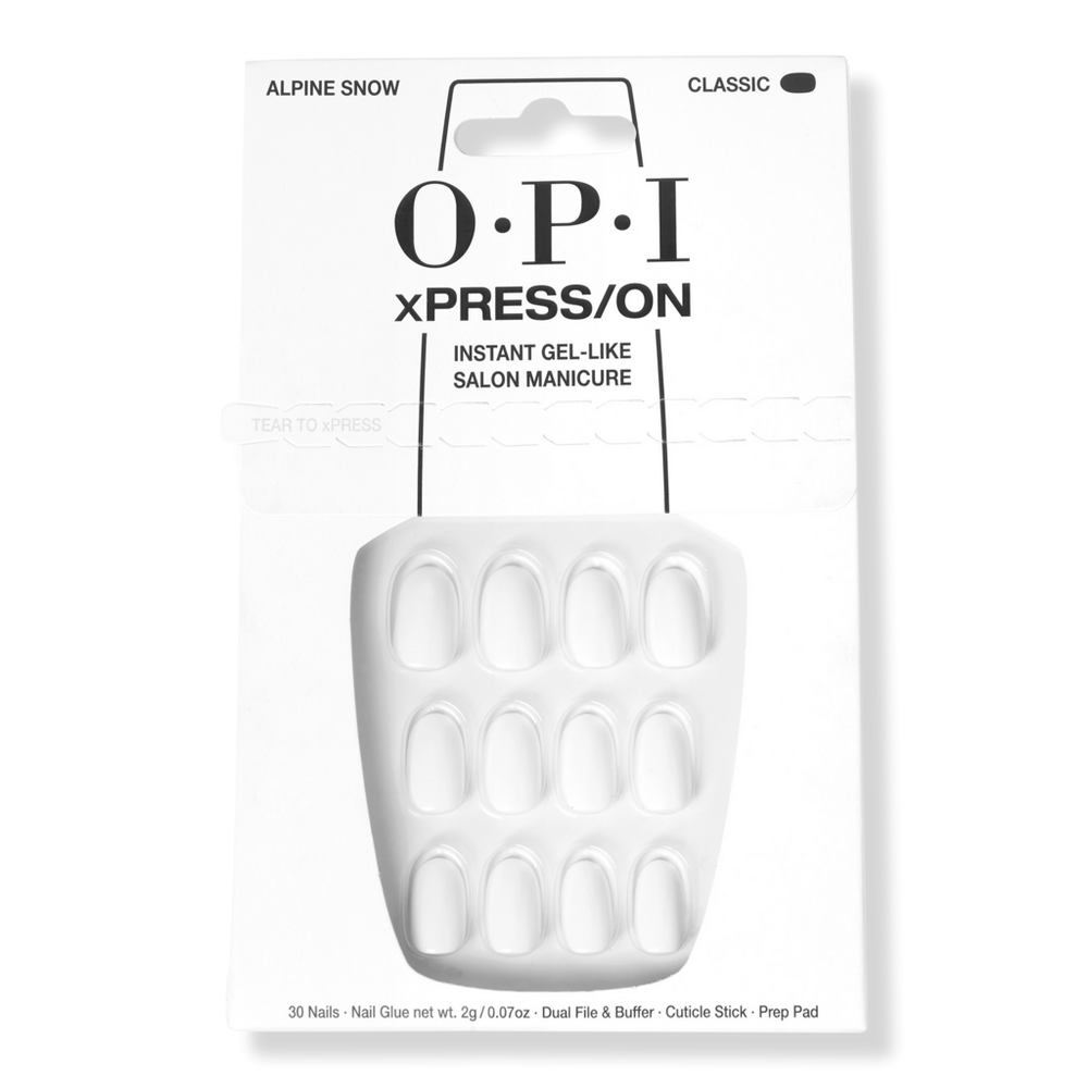 WK37 OPI ARTIFICIAL NAIL ALPINE SNOW. Benefits: 14 days of seriously head-turning wear. Reusable press-on nails so you can press again and again and again. Sustainability on point! Tips and packaging are made with up to 94% post-consumer recycled materials. No animal derived ingredients. Features: Get pressed up in crisp, classic white press-on nails. Keep your look clean and fresh with crisp white press-on nails from OPI. Each pack contains short, classic length nail tips with a rounded shape. Each xPRESS/ON kit puts professional quality shades, nail art designs, or innovative nail effects at your fingertips. Create your own custom look by mixing and matching different colors and designs.. Includes: 30 Nails in different mani sizes. Nail Glue. Cuticle Stick. Dual Nail File and Buffer. OPI Prep Pad.