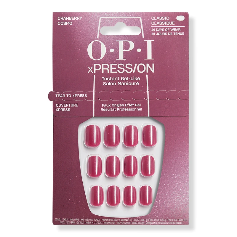 ANX SP26 CRANBERRY COSMO. Features: A bold cranberry crme topped with a high-shine glaze. Like the perfect cocktail, its strong, sweet, and impossible to forget. Best served with a side of mani-tude.. Benefits: 14 days of seriously head-turning wear. Reusable press-on nails so you can press again and again and again. Sustainability on point! Tips and packaging are made with up to 94% post consumer recycled materials.. No animal-derived ingredients or by-products.. Includes: Nail glue. Cuticle stick. Dual nail file and buffer. OPI Prep Pad. 30 nails in mani sizes to fit you perfectly.