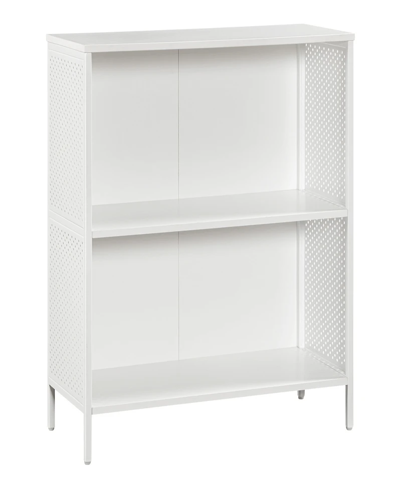 Solve your practical storage solution in style with our wood and metal storage bookshelf, the woodgrain finish and perforated metal sides give it a modern industrial style and that will elevate any room. Say goodbye to cluttered spaces and hello to organized living with our wood and metal storage bookshelf.
