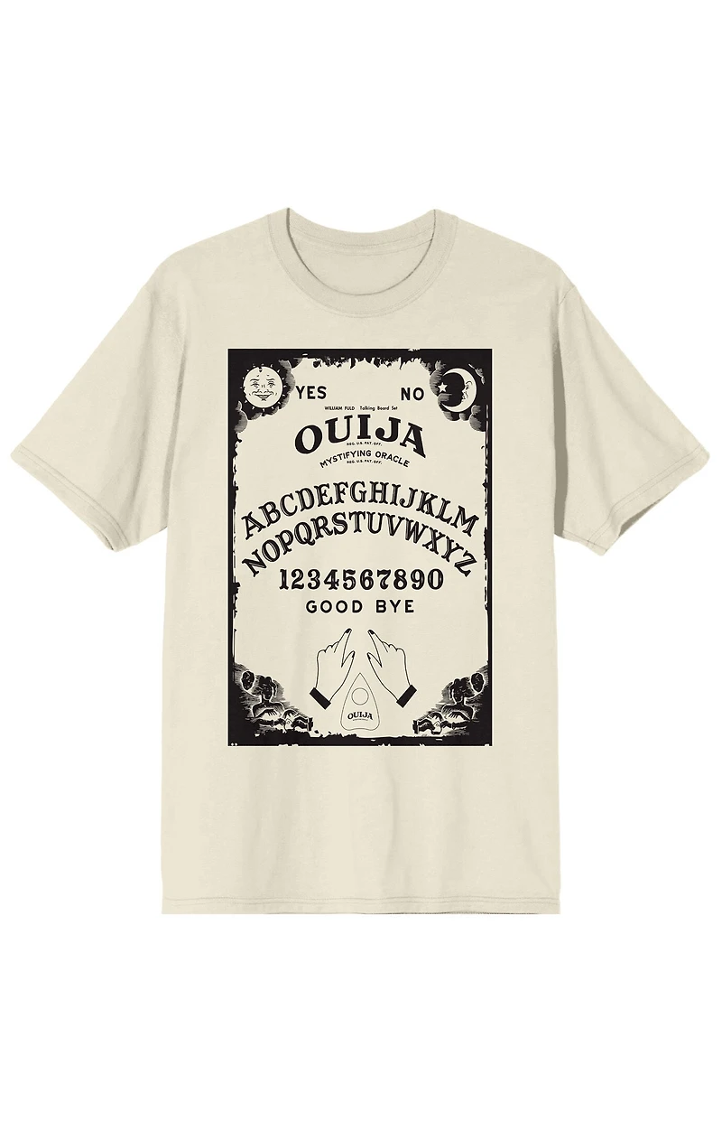 Conjure eerie style with this adult natural Ouija crew neck short sleeve t-shirt. Featuring a vertical game board with the alphabet, numbers, yes and no, and goodbye messages with sun and moon icons in the corner and hands moving the planchette below, this graphic tee delivers bold, spooky style. Made with soft cotton, it ensures lasting comfort and durability for all-day wear. For simple care, machine wash it on cold with like colors and tumble dry on low heat.