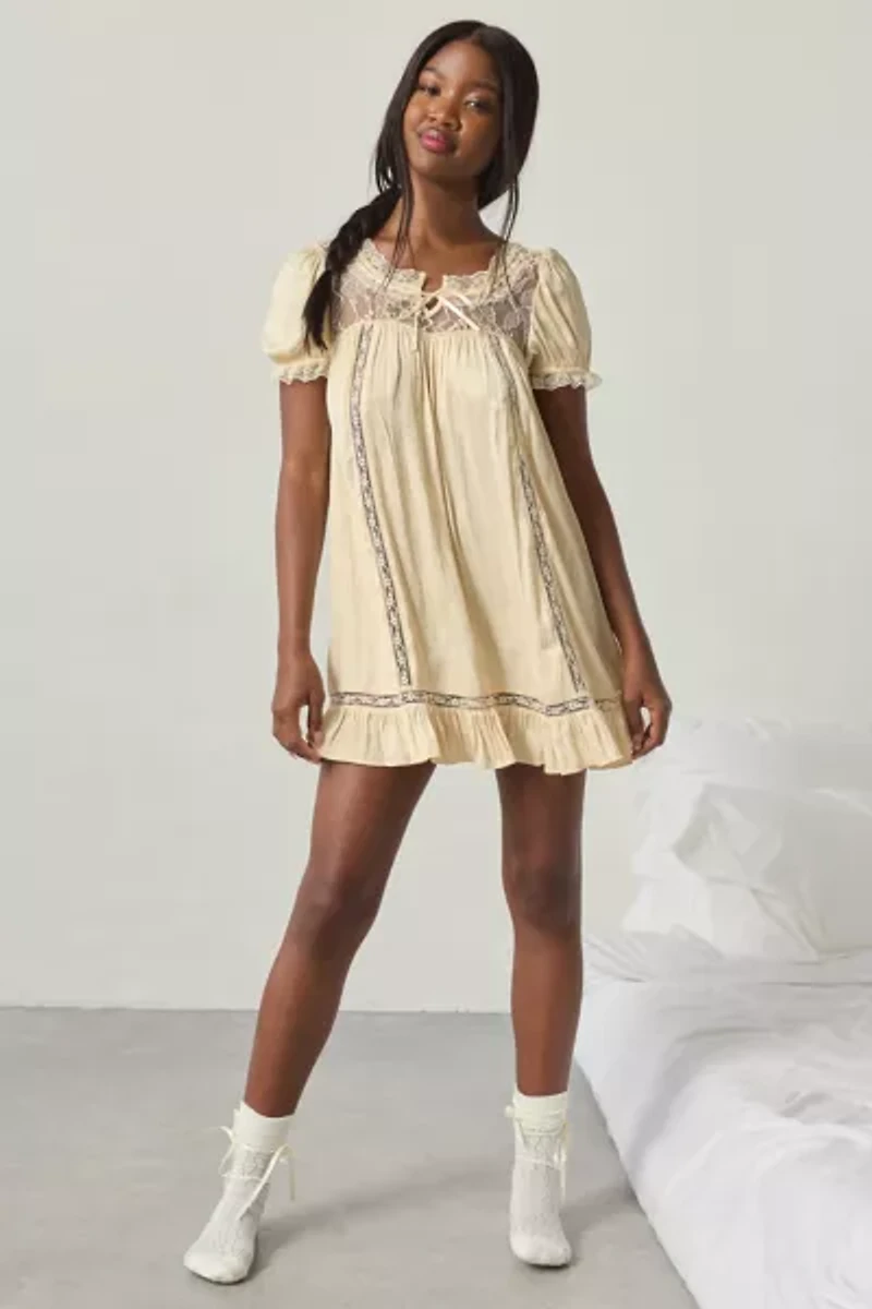 Oh-so-femme Out From Under sleep dress in a flowy silhouette inspired by the ‘60s babydoll aesthetic. House dress designed in soft-touch satin with sheer lace insets featuring a crew neckline with a tie-front ribbon, puff sleeves and a ruffled hem. Perfect paired with slippers for a night in or tall boots for a trending outfit idea! Only at UO.