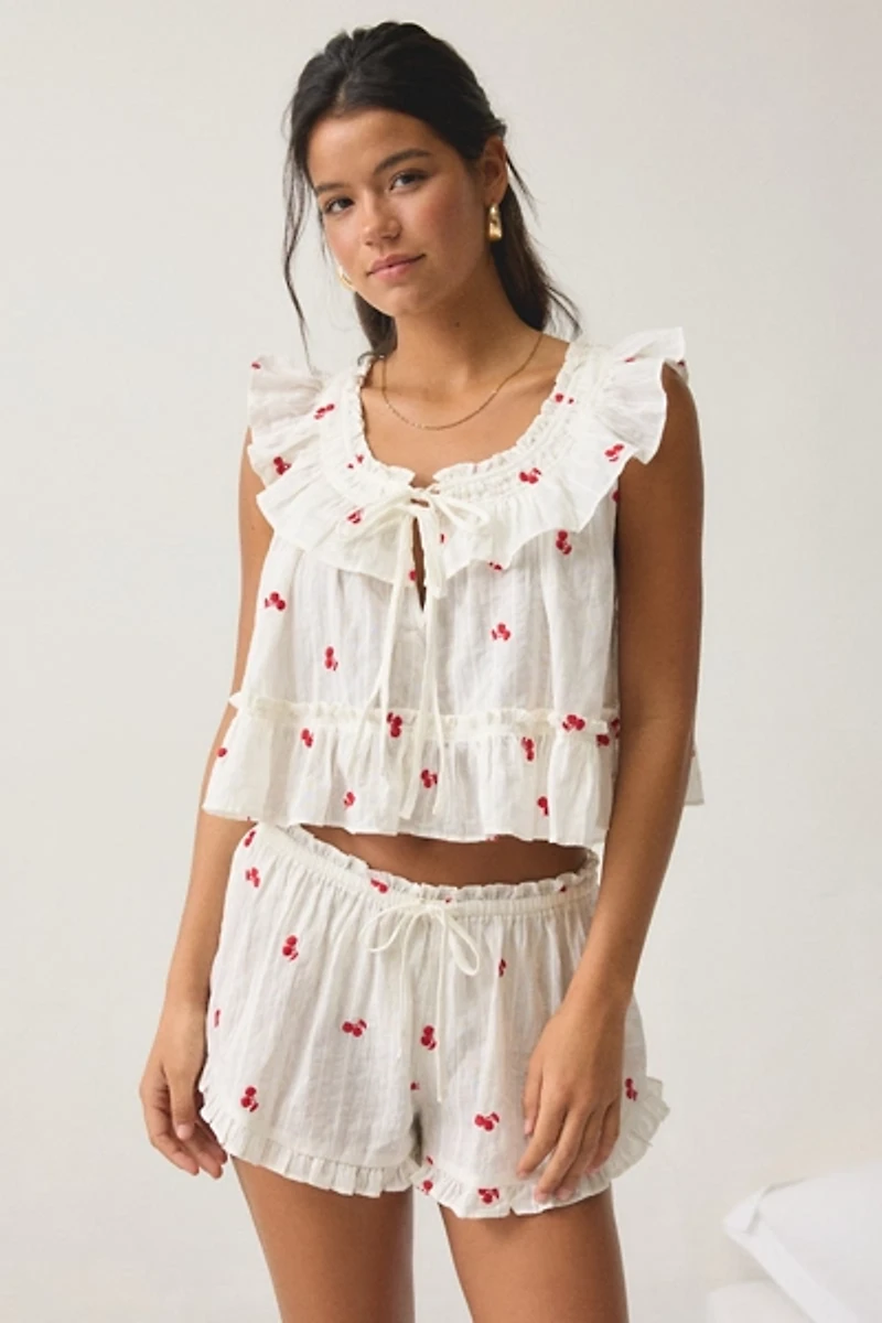 Out From Under 2-piece pj set designed in a soft, lightweight, 100% cotton for an airy, effortless vibe. Matching pajama set featuring a tie-front babydoll top and low-rise micro shorts. All topped with ruffle trims for a femme finish. Perfect paired together & mixed with your other OFU favorites. Find it only at Urban Outfitters.