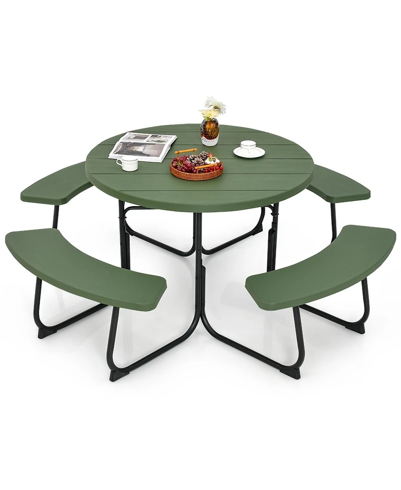 Outdoor 8-person Round Picnic Table Bench Set with 4 Benches & Umbrella Hole