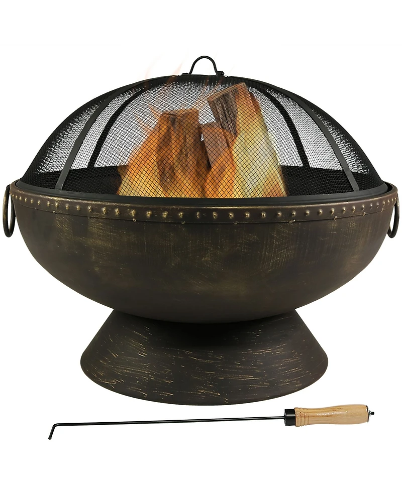 Outdoor Camping or Backyard Large Fire Pit Bowl with Spark Screen, Log Poker, and Metal Wood Grate - 30" - Bronze