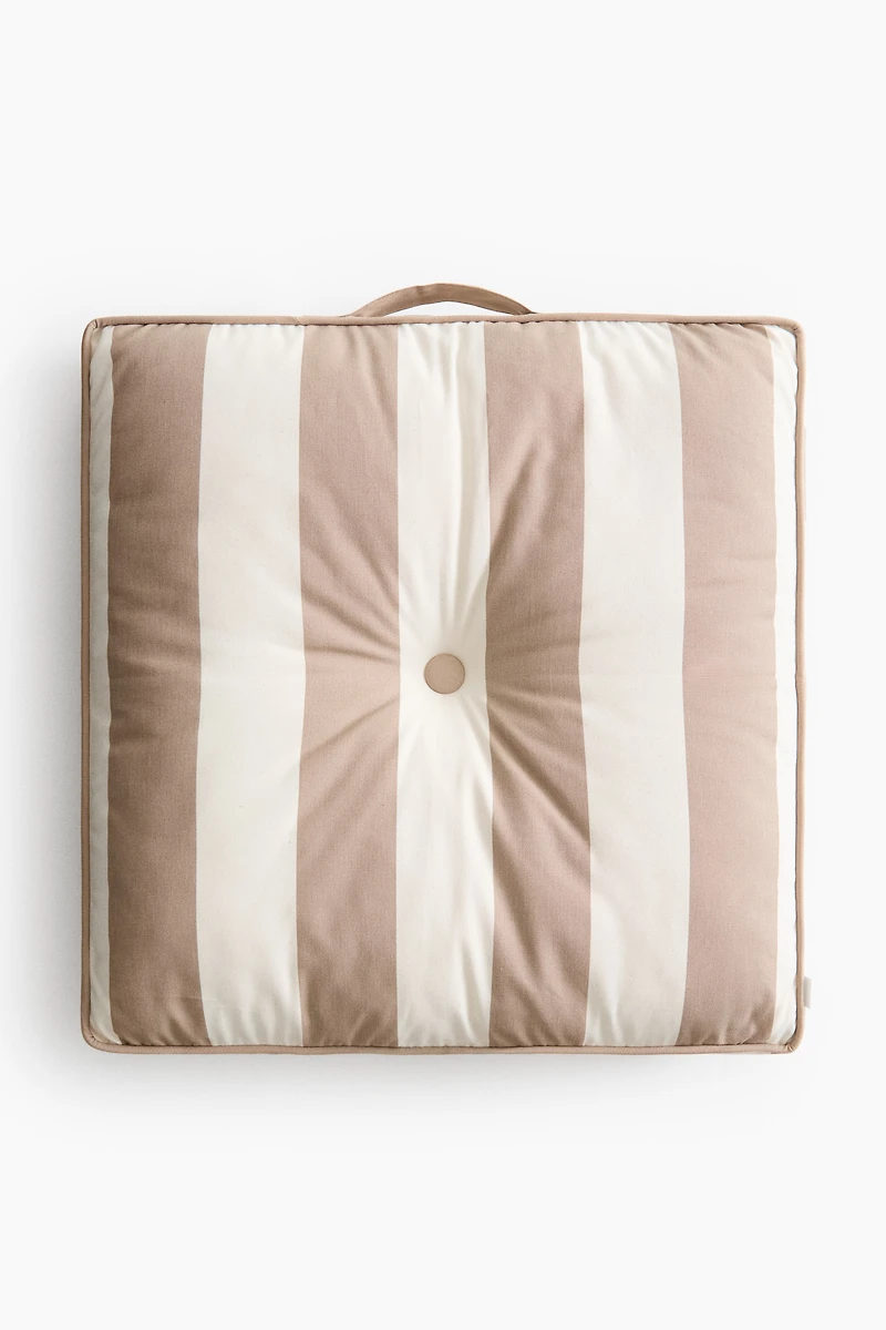 Padded floor cushion in water-repellent cotton canvas, suitable for outdoor use. Classic striped pattern, piping at edges, and a handle at one side for easy carrying. Store inside when not in use to keep it in good condition.