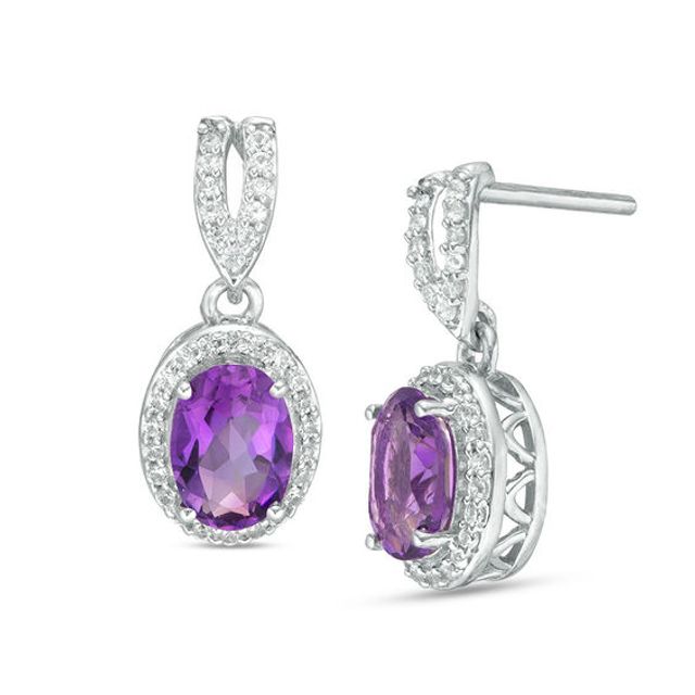 Oval Amethyst and Lab-Created White Sapphire Frame Drop Earrings in Sterling Silver