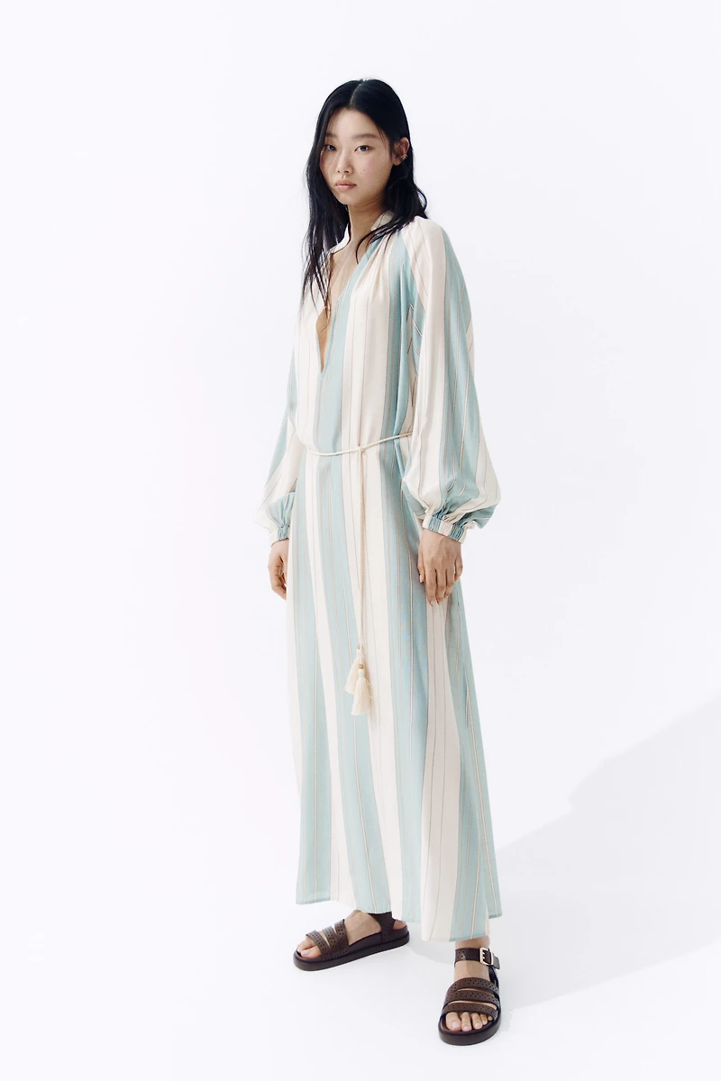 Long, oversized tunic dress in a woven viscose blend with a narrow, tasseled tie belt at waist. Stand-up collar with gathers, V-shaped low-cut opening at front with a concealed button-loop fastener, and long raglan balloon sleeves with covered elastic at cuffs. High slit at sides of hem. Unlined.