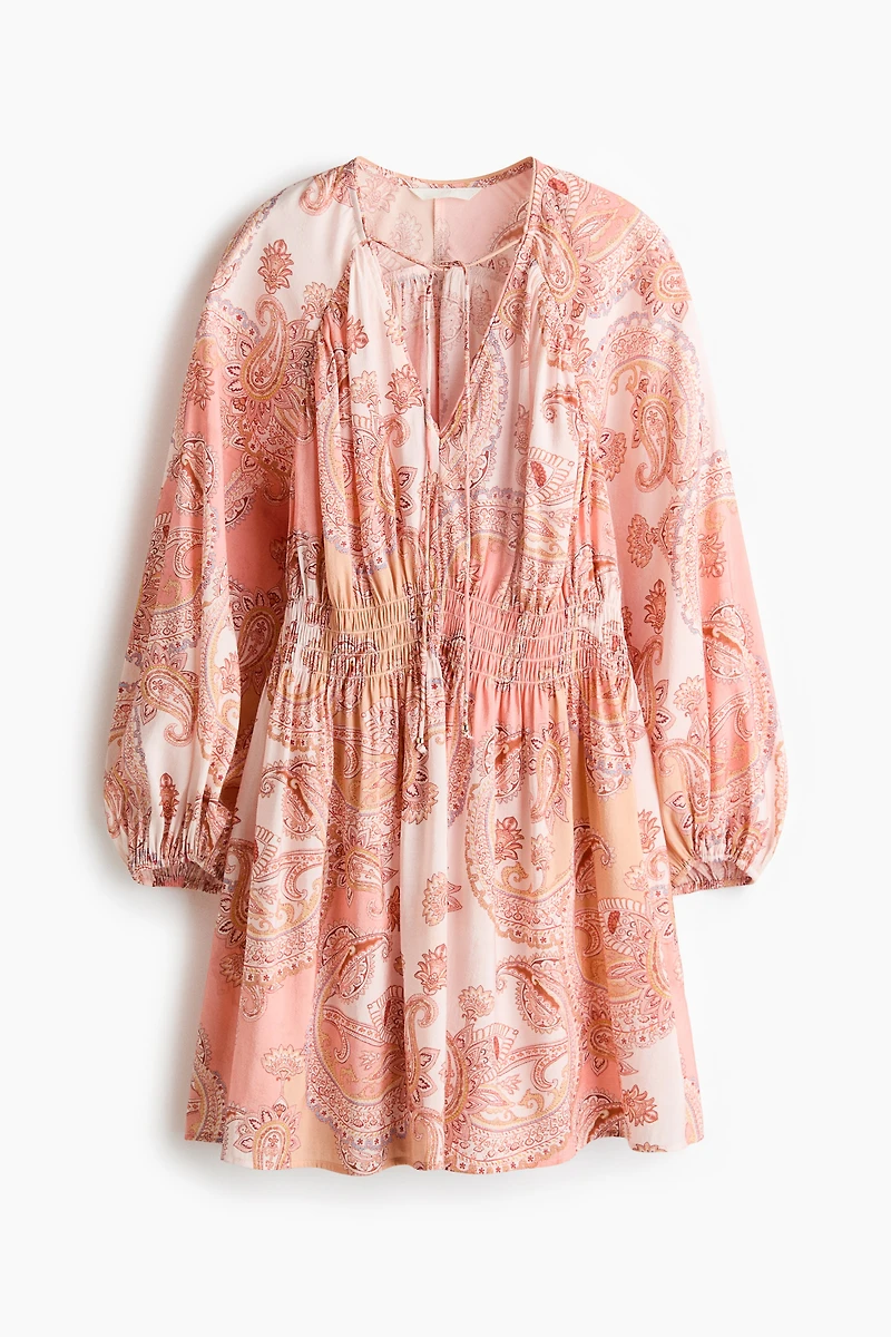 Short, oversized dress in a woven viscose blend. Low-cut V-neck at front with extra-narrow ties, gathered yoke at front and back, and long, voluminous balloon sleeves with elasticized cuffs. Smocked section at waist and a gently flared skirt. Unlined for a lightweight feel.