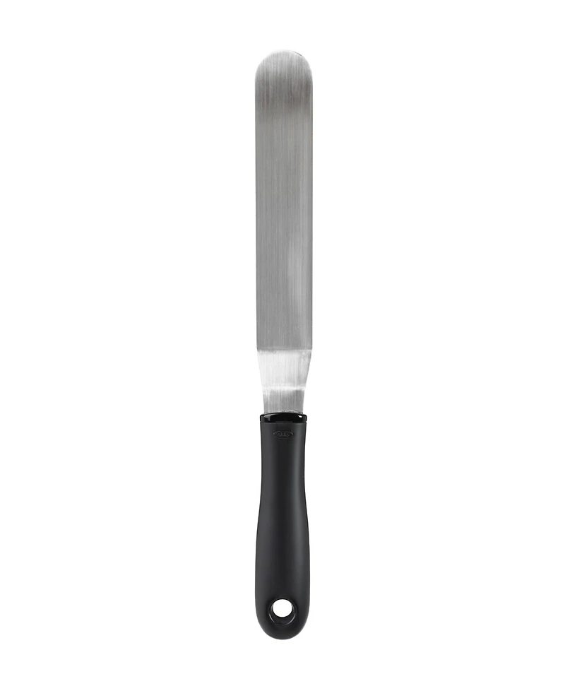 Finish desserts with professional polish using this Oxo Good Grips bent icing knife, featuring a wide, flexible blade for smooth spreading. An angled handle improves control and keeps surfaces clean.
