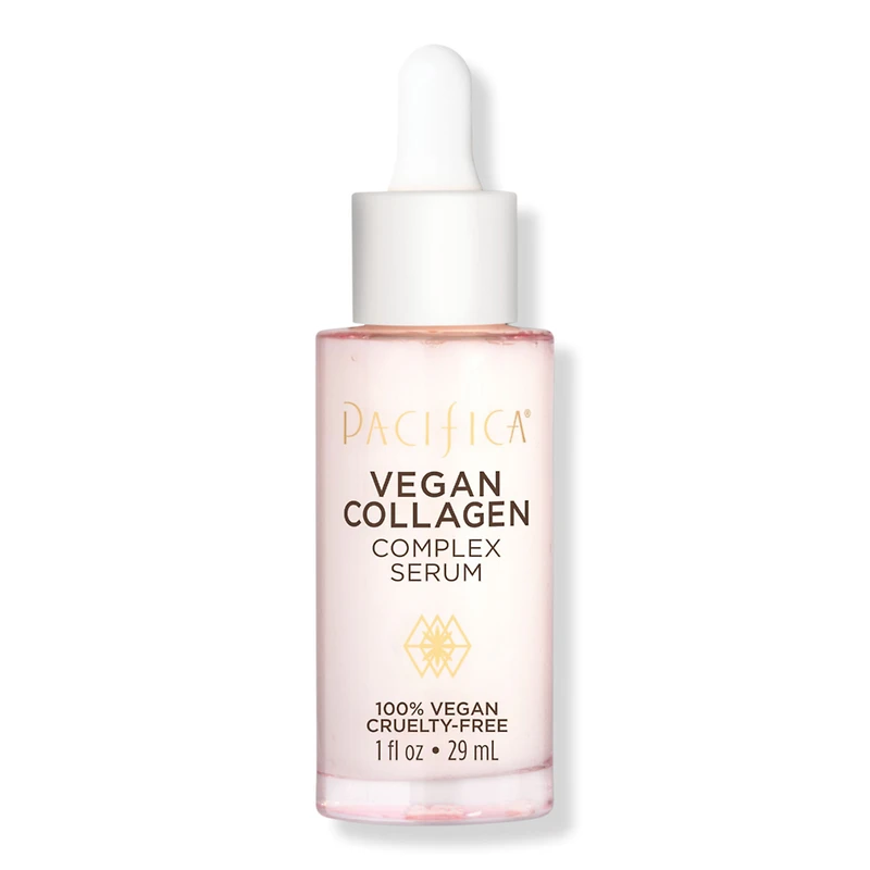 VEGAN COLLAGEN SERUM 1.0OZ. Benefits: Concentrated bioactive serum that supports a healthier, more supple appearance. Blend of Pacifica's innovative Vegan Collagen, hyaluronic acid, floral extracts and Japanese camellia oil, hydrates skin and promotes a smoother, more plump skin appearance. For all skin types. 100% Vegan and Cruelty Free. This pretty bottle is made with glass - recycle and give it another life. Scent: subtle white floral notes. Key Ingredients: Vegan Collagen: Pacifica uses real collagen proteins produced through a plant-sourced fermentation process that uses zero animal inputs while demonstrating its equivalence to animal-derived collagens through structural, biochemical, physical and biological properties. Hyaluronic acid: A beloved ingredient that has been shown to hold 1000 times its weight in moisture. Vegan Squalane: Helps calm and balance skin oil production, without feeling heavy or greasy. Japanese Camellia: Age-defying, polyphenol antioxidant. Formulated Without: Parabens. Phthalates. SLS. Mineral Oil. Silicone.