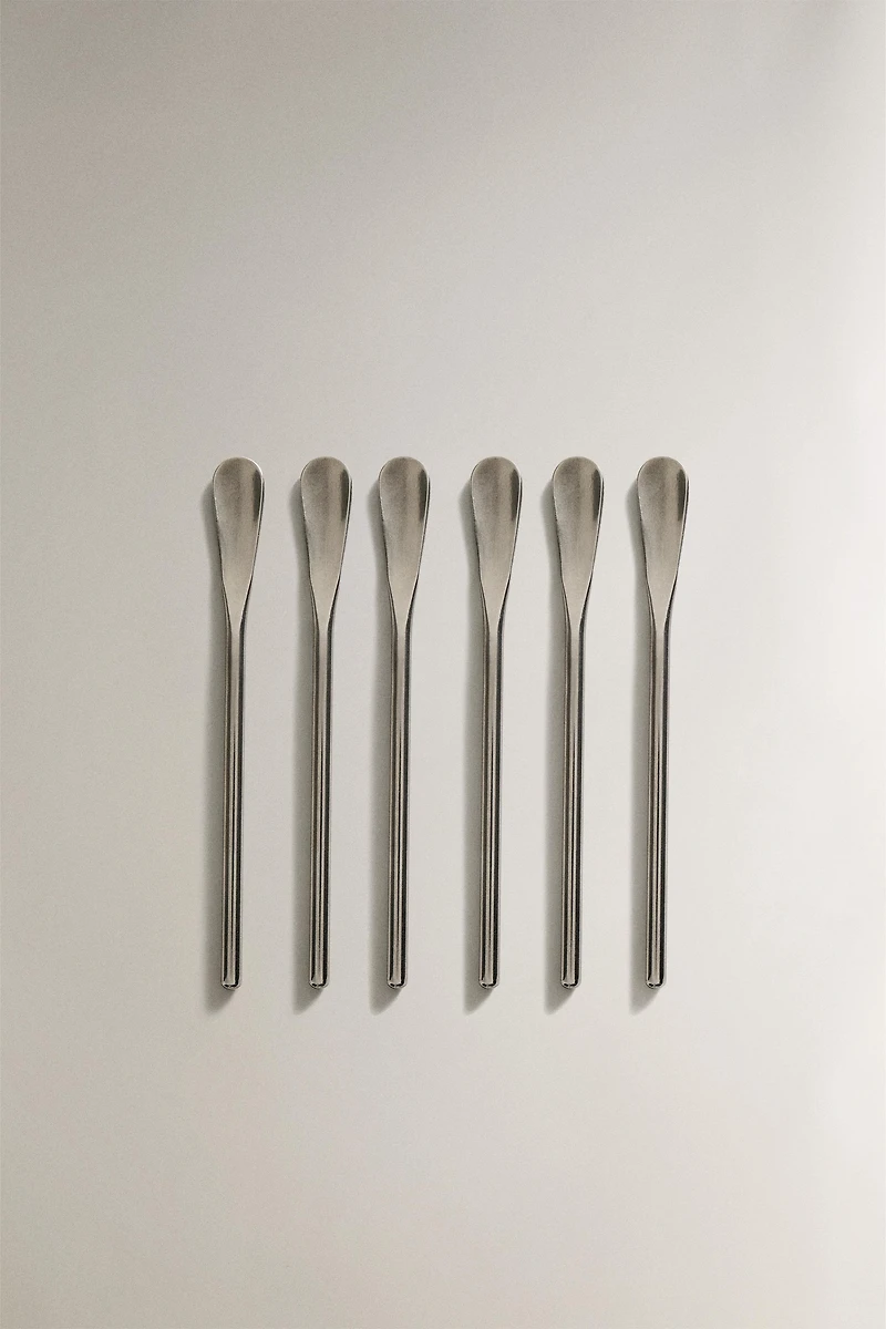 Stainless steel coffee spoons with thin, elongated handles and a shiny finish. The pack includes 6 units.