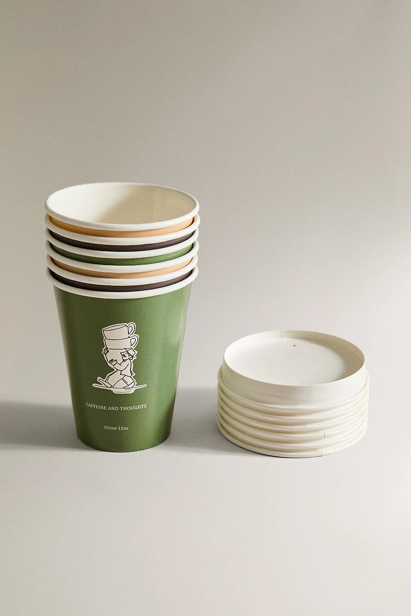 Paper tumblers with a lid, featuring an illustrated coffee-inspired design. The pack includes six tumblers and six lids, distributed in three different colours, with two units of each colour.