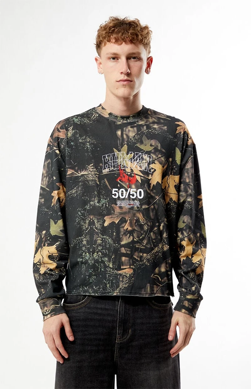 The Human 5050 Camo Cropped Long Sleeve T-Shirt from Pacsun is a must-have for your casual wardrobe. With a camo print, long sleeves, a classic crew neckline, front and back graphics and a trendy cropped fit, this tee effortlessly combines comfort and style for any occasion.