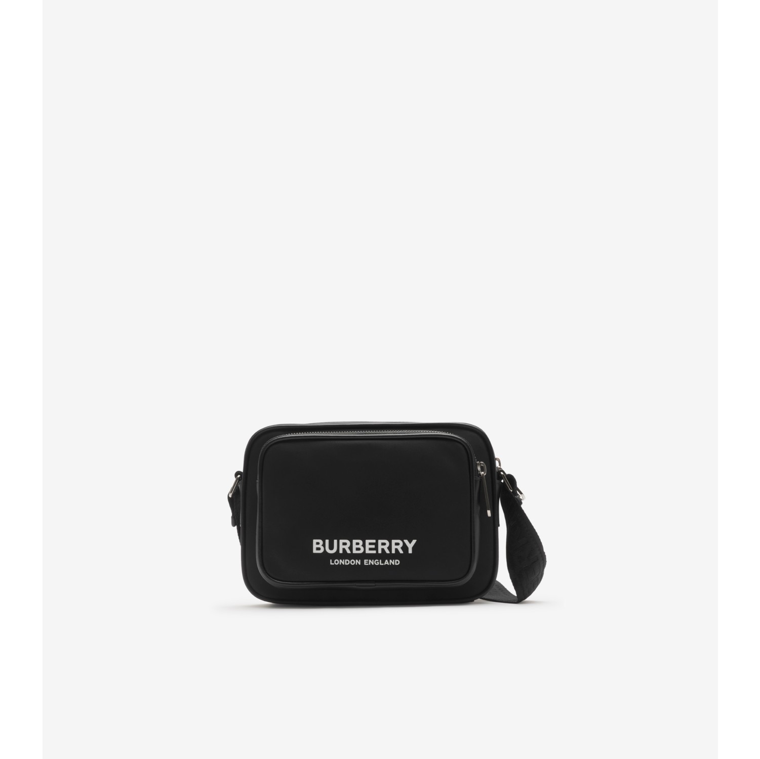 A crossbody bag in nylon printed with raised Burberry lettering and lined in a matching material. The compact style is trimmed with leather and features an adjustable strap with a jacquard-woven logo. Adjustable crossbody webbing strap Zip closure Exterior zip pocket, exterior slip pocket with magnetic closure Three card slots Hand-painted edges Polished metal hardware Nylon lining Comes with a dust bag