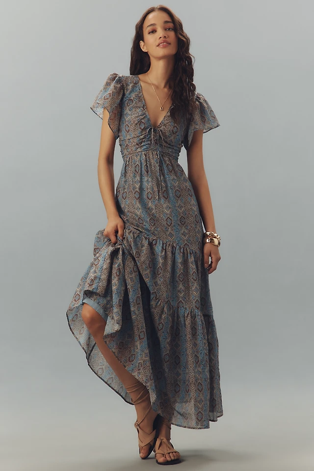 PAIGE Kinga Silk Blend Flutter-Sleeve Tiered Maxi Dress
