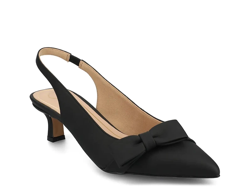 Polish off your look with the darling Paloma pump from Journee Collection. This stylish slingback is crafted with a trendy kitten heel, a sleek pointed toe, and a charming bow acccent on top.