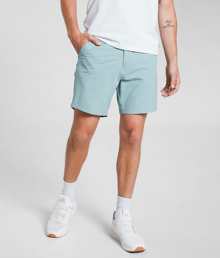 Heathered flat front short 12" rise Back snap and zip welt pockets Zip fly Quick dry