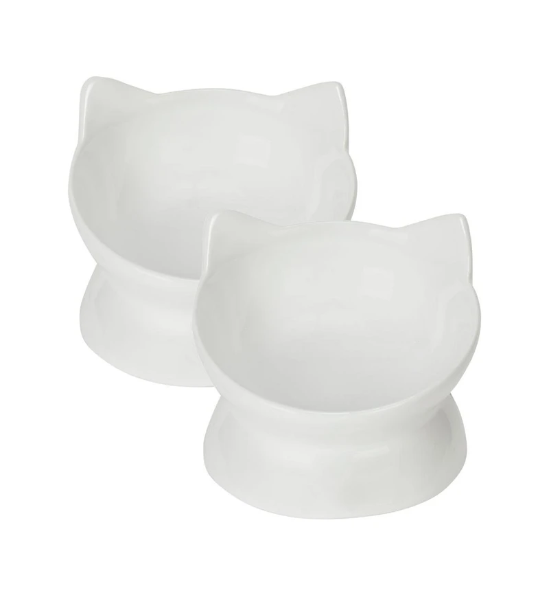 A set of two cat bowls. This ergonomic design enables your feline friend to enjoy their meal at an elevated position minimising strain on both the spine and neck.