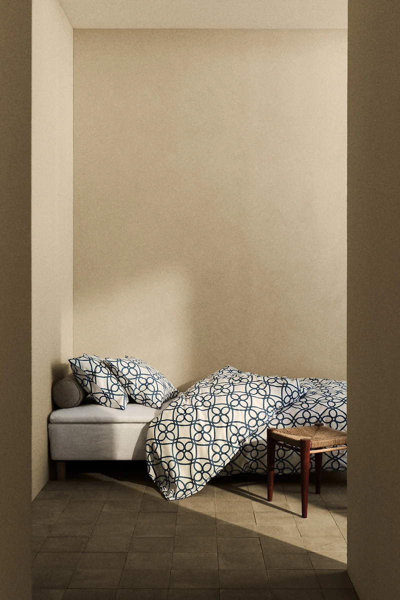 Twin duvet cover set in soft woven cotton with a printed pattern and piping at edges. Duvet cover with opening at foot end for quick and easy bed-making. Matching pillowcase with envelope opening.