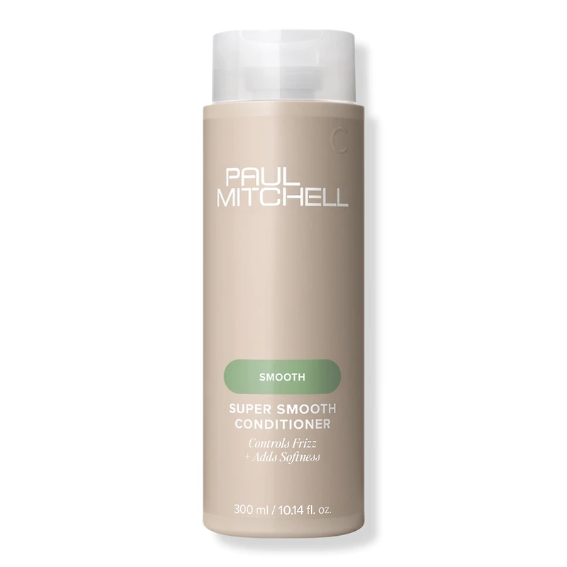 SUPER SMOOTH CONDITIONER 33.8OZ. Benefits: Helps reduce frizz + improves manageability. Ideal for frizzy hair. Perfect prep for a smooth blowout. Up to 80% smoother hair (When using Super Smooth Shampoo & Conditioner. Based on third-party testing.). Features: Lush juicy scent with notes of apple, dewberry, white peach and wild strawberry. New packaging made with post-consumer recycled (PCR) materials & low-profile caps as part of Paul Mitchell's long-standing commitment to the environment (Bottles & jars will be 50% PCR & tubes will be 25% PCR. Retail sizes only. Excludes pumps & select caps, which are made from virgin materials.). Paraben free. Made without gluten. Key Ingredients: Formulated with plant-derived squalane to help reduce frizz and improve manageability.
