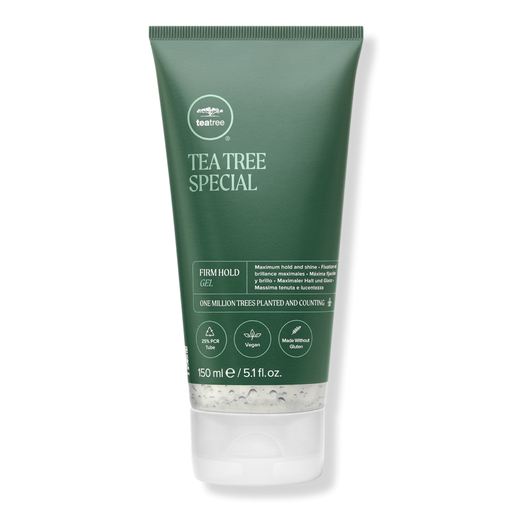 TEA TREE FIRM HOLD GEL NEW 5.1OZ. Benefits: NOTE: Paul Mitchell's packaging is getting a makeover and the product you receive may vary from the images that are shown. Firm hold without flaking. Helps thicken + build body. Adds shine. Can be applied to wet or dry hair. Ideal for all hair types, especially fine-medium. Great for long-lasting spikey looks, slick backs or faux hawks. Features: Mint, tea tree + citrus provide a reviving aromatherapy-inspired experience. Look for the post-consumer recycled symbol on packaging as part of Paul Mitchell's long-standing commitment to the environment. Color safe. Vegan. Paraben free. Gluten free. Key Ingredients: 100% Australian tea tree is sourced from a farm in Australia that is certified for their responsible sourcing + harvesting practices.